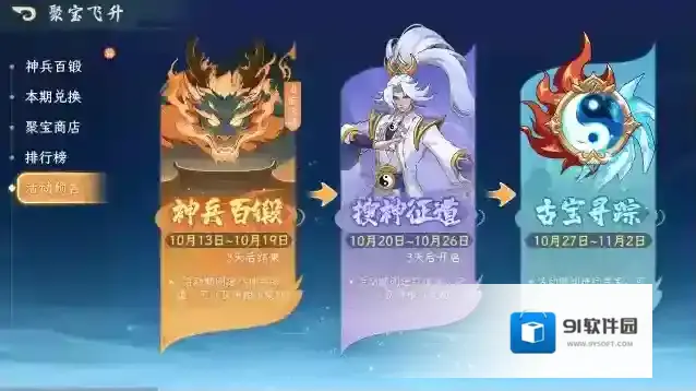 活动说明:聚宝飞升每7天会更换不同的活动,活动期间进行寻宝、神兵锻造、搜神可以获得相应奖励;还可获得飞升令兑换封神榜、乾坤袖、自选红色装备等稀有道具,具体活动详情可在游戏内聚宝飞升查看。