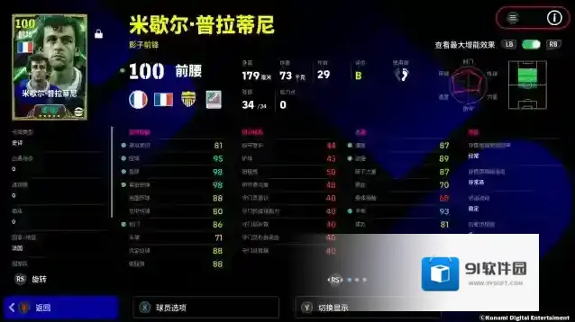任意球绝对是普拉蒂尼的拿手好戏!出色的罚定位球数值让他用一脚刁钻的任意球越过人墙,直挂死角!