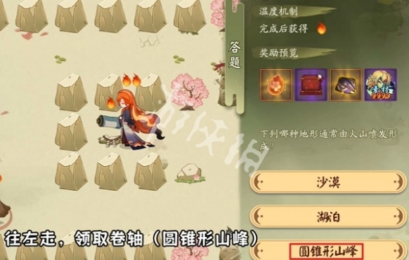 10、往左走,领取卷轴,答案是圆锥形山峰。