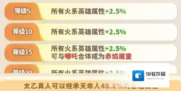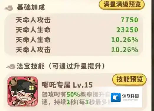 另外,哪吒和太乙真人的专属法宝很重要,对英雄的强度提升很大,满星的哪吒专属法宝效果为普攻时有50%概率提升自身200%攻速,持续2秒。