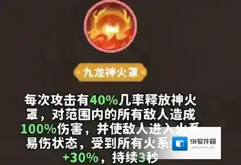 非常实用的火系增伤技能,开启九龙神火罩后,能让范围内敌人受到的火系伤害增加30%。