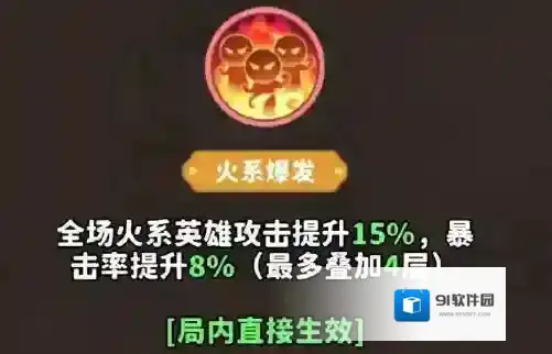 全场火系英雄攻击提升60%,暴击率提升32%(最多叠加1层