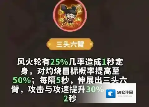 风火轮有25%几率造成1秒定身,对灼烧目标概率提高至50%;每隔5秒,伸展出三头六臂,攻击与攻速提升30%,持续2秒。