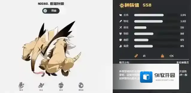 风滚暮虫和巨噬针鼹属于特殊机制精灵。风滚暮虫技能“飞速旋转”先手+1并提升威力,适合速攻流阵容,巨噬针鼹则拥有“石锁”技能,伤害随使用次数动态调整,需精准计算连击节奏。这两只精灵操作难度较高,适合喜欢策略性的搭配战术。新手可暂时搁置,等熟悉游戏机制后再培养。