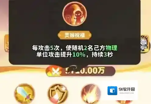 每攻击5次,使随机2名己方物理单位攻击提升10%,持续3秒。攻击提升幅度一般,不过这个技能是没有上限的,增益可以一直叠加。