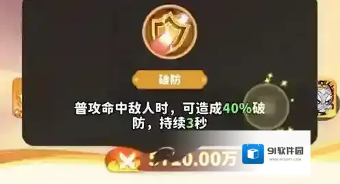 普攻命中敌人时,可造成40%破防,持续3秒,可以帮助C位打出更高伤害,以及配合各种需要破防的技能。