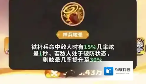 铁杆兵命中敌人时有15%几率眩晕1秒,若敌人处于破防状态,则眩晕几率提升至30%。神兵眩晕是范围群控技能,需要配合神兵攻击和其他带有破防效果的物理辅助使用,可以延缓敌人的进攻步伐。