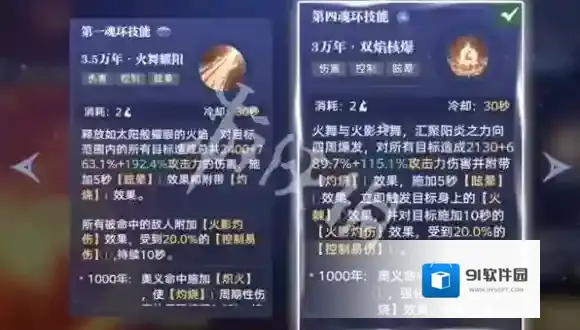 3、火影奥义选择第四魂技,会对周围所有目标造成一定攻击力伤害,并附带灼烧效果,施加5秒眩晕效果,并对目标施加10秒的火影灼伤效果,受到20.0%的控制易伤。