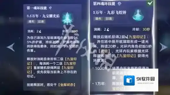 4、九宝琉璃塔奥义选择第四魂技,释放后随机获得2层,九宝印记并在场中展开琉璃塔形成一道光环,持续20秒,光环内角色初始5秒内无敌,光环内玩家根据光环释放者当前的九宝印记获得光环效果。