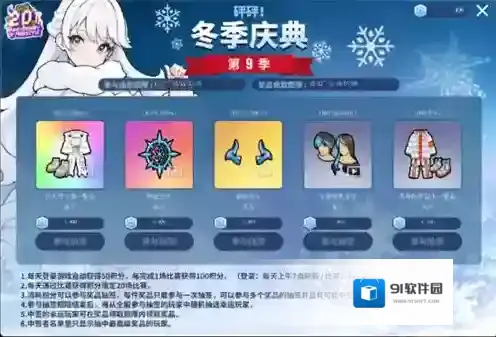 玩家每天通过比赛以及登录可以获得积分,消耗积分可以参与奖品抽签,每件奖品只能参与一次抽签,可以参与多个奖品的抽签,奖励包括超大号冬季一整套等稀有奖励。