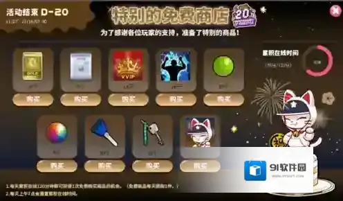 为了感谢各位玩家的支持,我们准备了特别的商品,玩家每天累计在线120分钟即可获得1次免费购买商品的机会,免费商品每天限购一件!