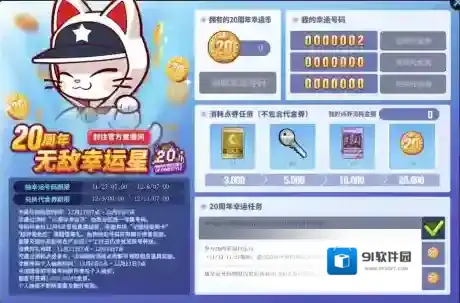 玩家可以通过消耗20周年幸运币抽取全区唯一专属号码,号码可以参与12月8日周年庆福利直播夜抽奖,奖励包括“全超特变更卡全家福”、“超特角色包”等百万豪礼。12月9日起玩家还可以参与个人抽奖,领取最高200万代金券奖励。