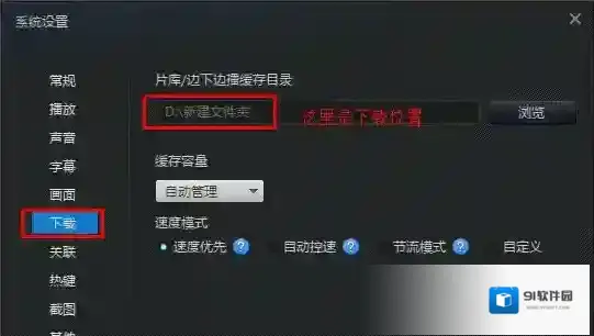 注意:下载位置在播放电影时,右击鼠标或点击键盘上F2键,弹出菜单中选择“设置”项。然后弹出对话框中,点击左侧的下载项,然后在右侧可以看到下载的位置。