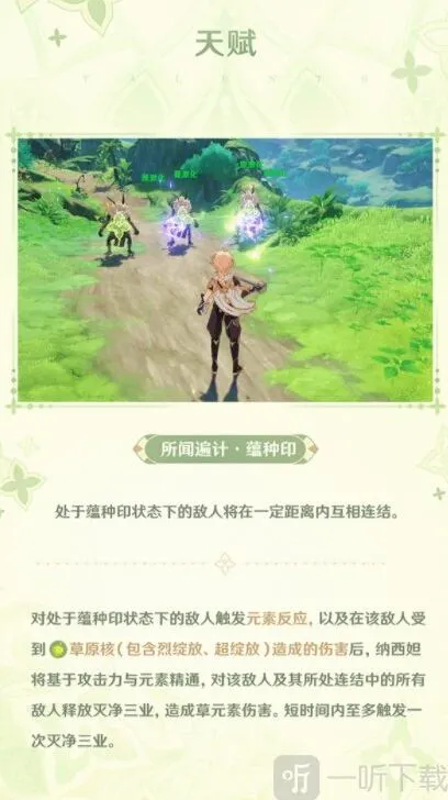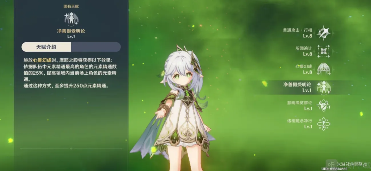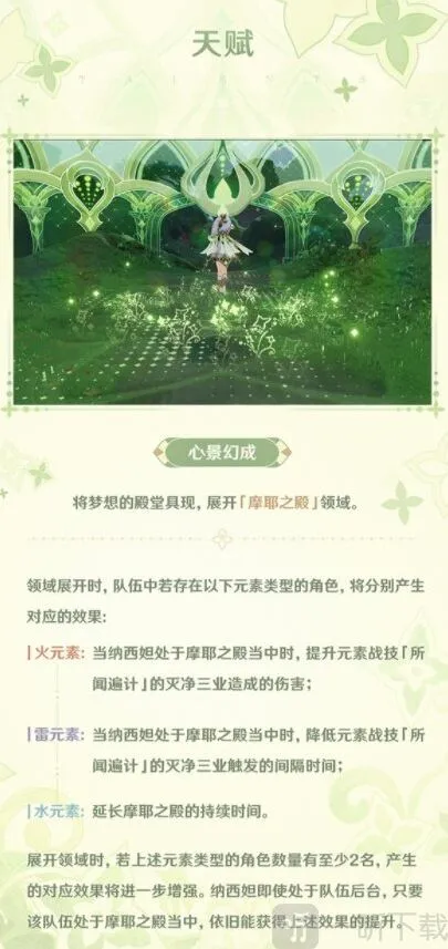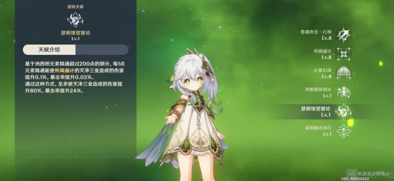 固有天赋2:由于该天赋描述效果,所以需要尽量拉高纳西妲的元素精通