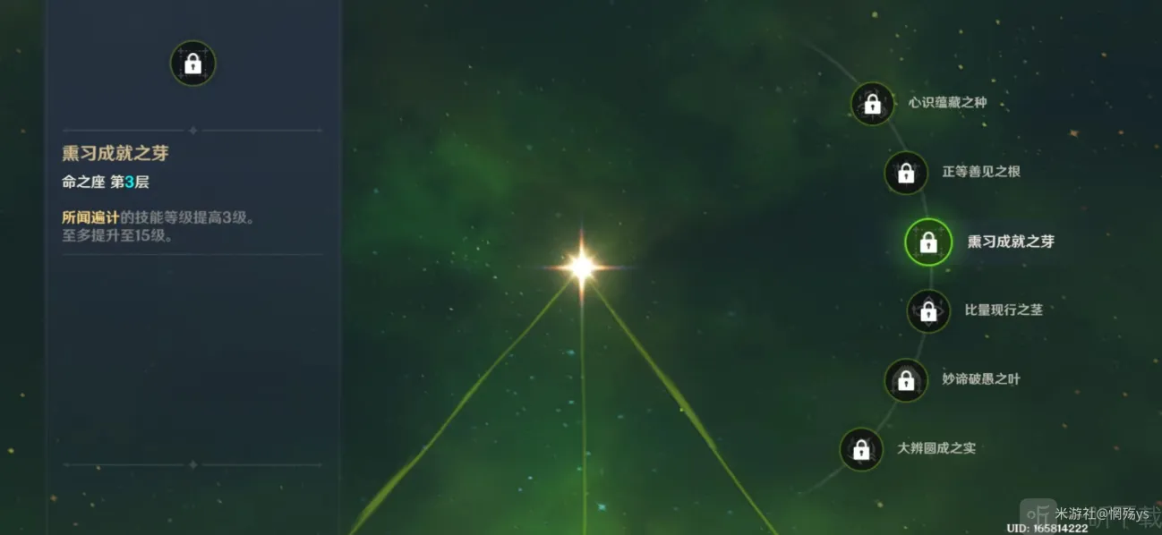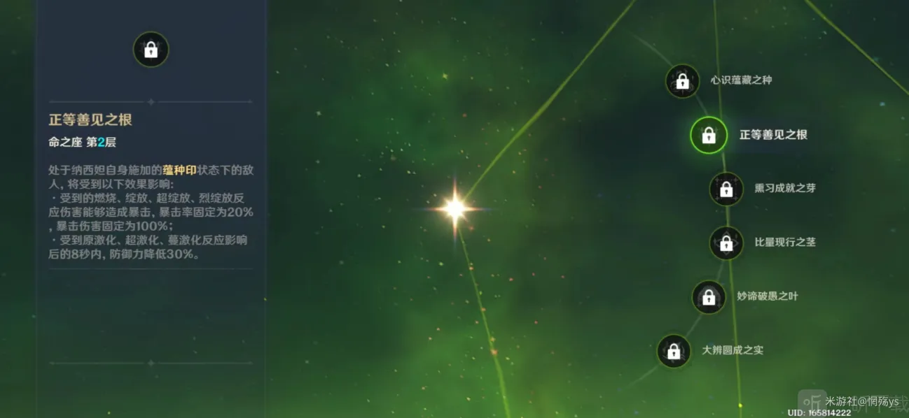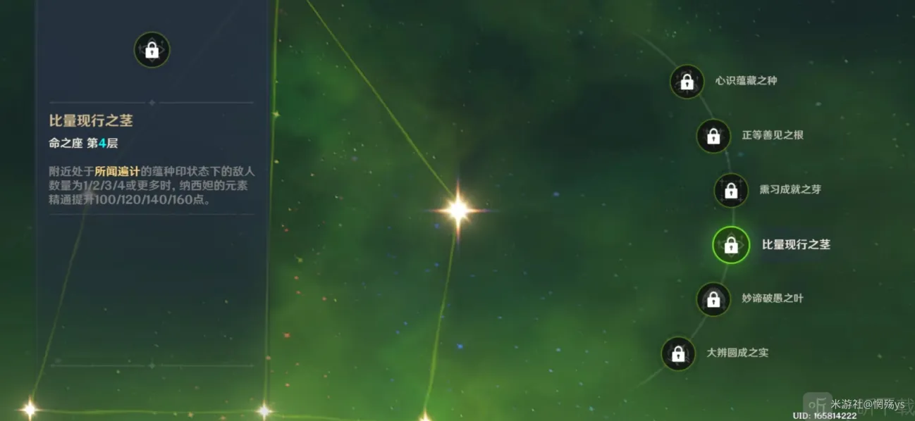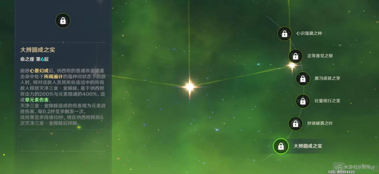 四命:通过元素战技效果提升纳西妲自身精通,对反应伤害有一定加成