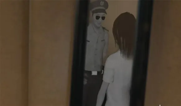 进入教官室,可以找到情杀事件报道和风水学的书籍,不过此时有人来了,主角赶紧蹲下把花放到地上。