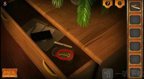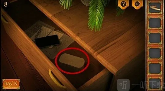 6、来到右边的抽屉,点击里边的盒子(图中红色圆圈所示),打开盒子获得钥匙。