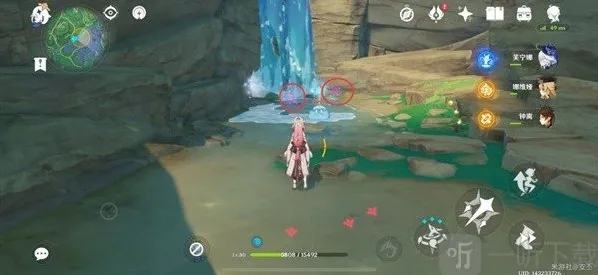 来到瀑布下,平A攻击,获取两个「绯樱绣球」,此处有只冰史莱姆看守,小心注意