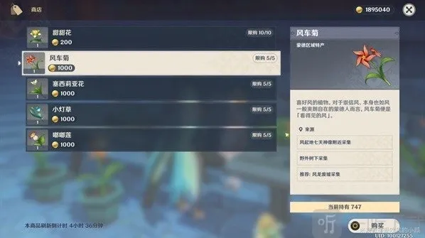 7.购买点在蒙德城入口处,找到一个NPC芙萝拉(小女孩),对话触发NPC商店可购买,共5朵
