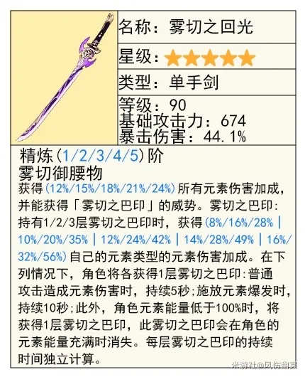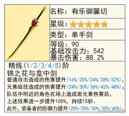 这把需要有命契辅助给希诺宁增加命契时才能用,没有命契的话就是一把很普通的五星爆伤武器,就算满精,也就只有84.1%爆伤,不但少了「有乐御帘切」的4.1%爆伤,还少了特效提升。