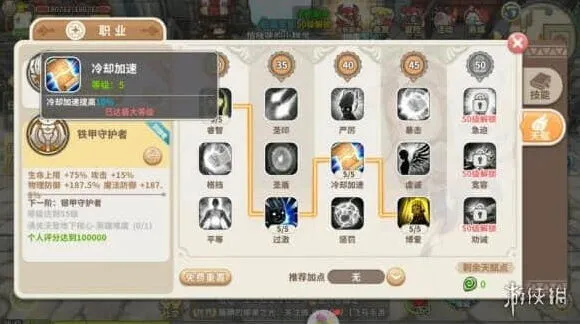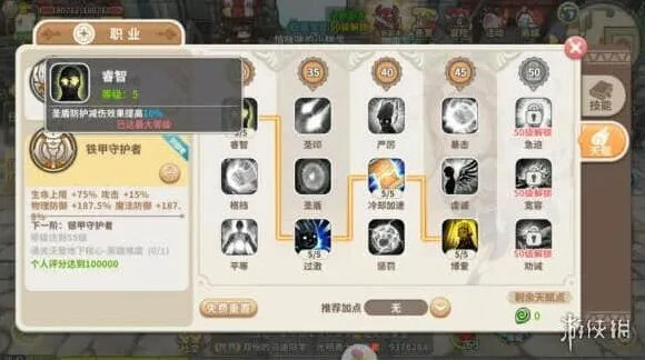 守护者的天赋加点推荐半肉减冷却加点,从30级到45级的天赋选择依次为:睿智,过激,冷却加速,博爱。