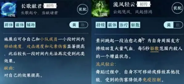 长歌献君是中后期获得的绝技,前期打副本可以用门派绝技流风轻云。竞技场可选繁花一梦补点伤害,后期不缺伤害用回长歌献君。