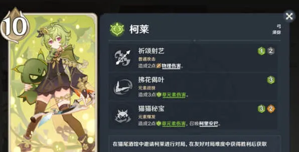 作为3.0版本新加入的草系反应角色,草系反应在七圣召唤中同样大放异彩。草元素不仅可以和水元素形成下一次火/雷伤害+2的草原核,还可以和雷元素反应生成下3次草/雷反应伤害+1的激化领域。加上柯莱本身元素战技伤害不低,元素爆发仅需要2充能的优势,可以说是雷系反应起飞的关键一员。柯刻不分家!