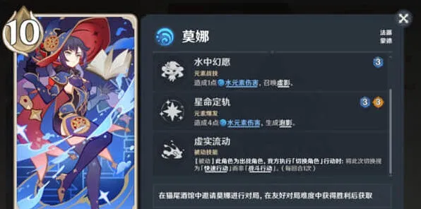 主要考虑她的被动虚实流动,通常可以作为战斗先出战的角色。然后通过释放水中幻愿给敌人施加水元素附着,再在下一回合直接通过快速切换出战角色(因为莫娜出战的前提下可以通过虚实流动获得切换角色属于快速行动,不消耗战斗行动)为打水系反应的角色。即便对方换了其他出战角色,也会被战斗结算阶段你已经释放出的水中幻愿的虚影进行一次伤害导致附着水元素!可以说敌人是肯定逃不过你这次水元素相关反应的(部分对战游戏中角色的特殊场地效果除外)!
