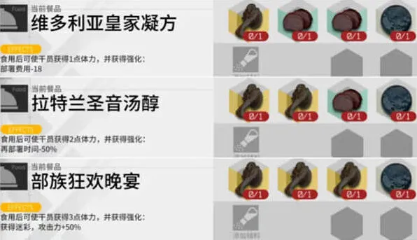 粮食(能量液)基本是不缺的,可以适当合成料理。特殊波次出现前,注意保证自己主力干员高体力,可以多次迎战,合成料理比较实用的是减部署费用(决战给快活吃),有资源也可以做几个减速鼓风机。