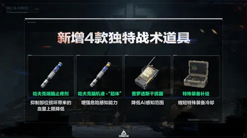 同时还新增了4款独特战术道具,解锁不同的战斗增益效果。这4款战术道具分别是普罗透斯干扰器–降低AI索敌距离;特殊装备补给–大幅缩短技能冷却;哈夫克脑机液-“超体”–增强危险感知能力;哈夫克端脑止疼剂–抑制部位损坏带来的血量上限降低。