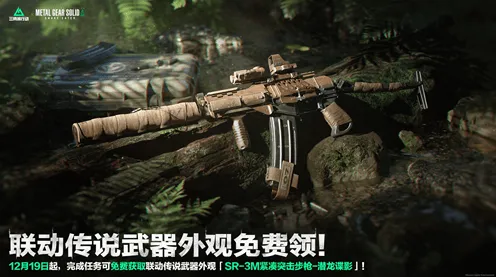 联动外观免费送活动也将于12月19日同步开启,完成联动活动可免费获取联动专属传说武器外观「SR-3M紧凑突击步枪-潜龙谍影」。同时,全面战场模式也将加入特色联动弹药箱,其融合了《潜龙谍影△:食蛇者》的经典元素,可在对局中互动体验。