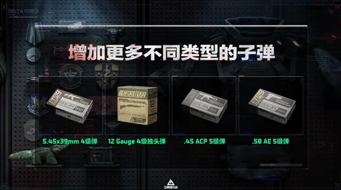 除了玩法上的更新,烽火地带模式还增加了不同类型的子弹及特殊战术道具。包含5.45x39mm 4级弹、12 Gauge 4级独头弹、.50 AE 5级弹、 .45 ACP 5级弹等,更强大的火力输出,更多变的改枪选择,带来全新的战斗体验。