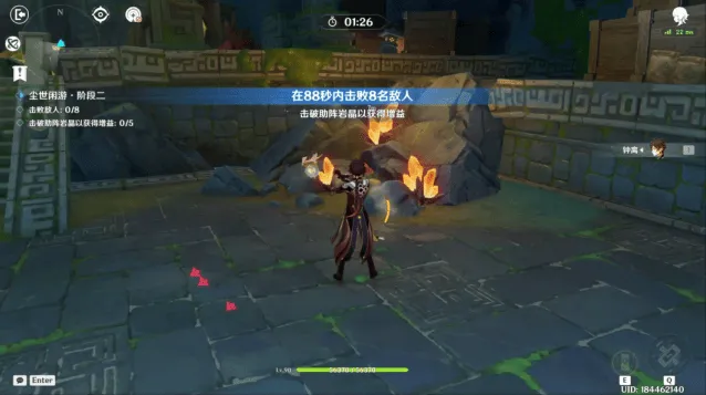 如图,在地图的四个角落会有岩晶刷新,每当把角落刷新的5块岩晶打碎,即可获得30秒的强化,在强化期间,普通攻击每隔4.5秒会释放威力强大的冲击波,对全屏敌人造成接近7W伤害,第一波、第二波敌人可以承受4次冲击波,第三波敌人可以承受5次冲击波。在屏幕左上角会有强化的时限提示。