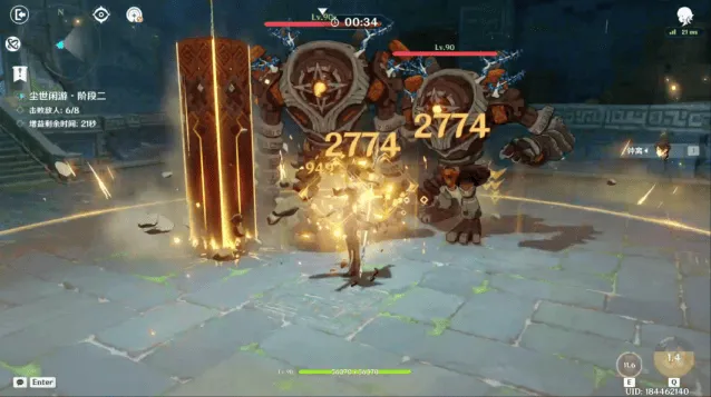 第三波敌人是2个大宝,虽然他们单次伤害高,但攻击方式迟缓,很难打破钟离的护盾。他们可以承受5次冲击,因此至少需要留出35秒左右的时间对付他们。在获取晶石强化后,只要时间充足,哪里亮了点哪里即可。