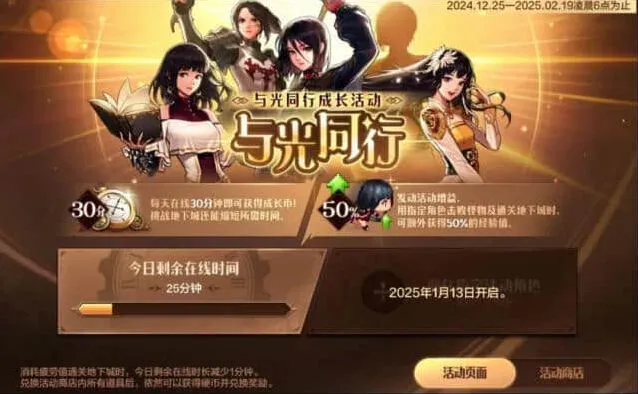 12月25日至2月19日活动期间,可以指定一个64级及以下的角色作为活动角色。活动角色击败怪物及通关地下城时,可额外获得50%的经验值。每天在线30分钟可获得成长币,挑战地下城还能缩短所需时间。