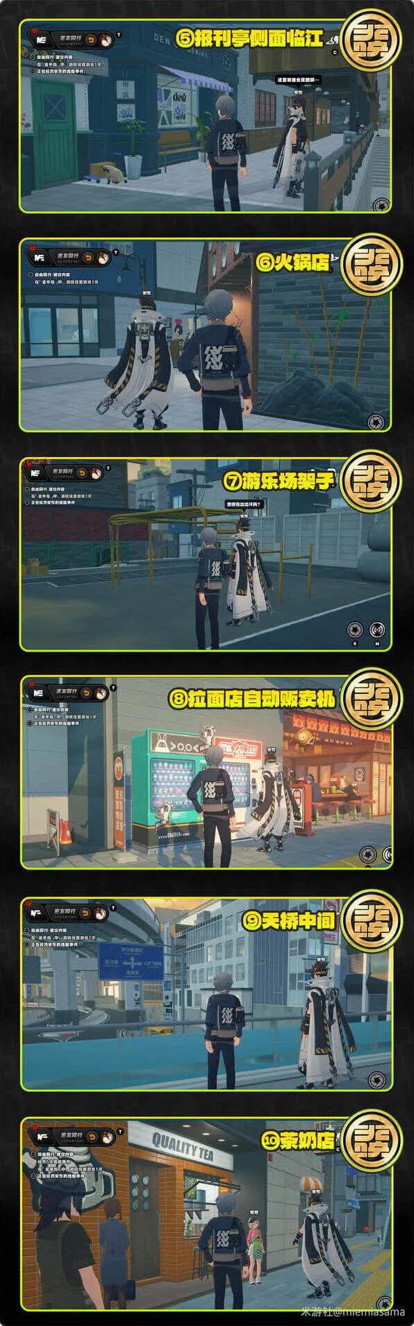 拉面馆、天台上方中间、警局门口、椰子树的鸽子警示牌、停车场的邦布充电桩。