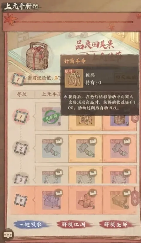 限时上元手册上线,大人们只要完成指定任务,就可以获得惊喜好礼。解锁高级手册,更有行商手令领取,可助您在悬灯结彩活动中收益倍增!