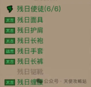 1、套装:选择残日使徒6件套,除了鞋子之外全带套装