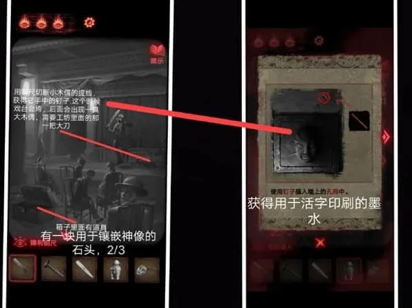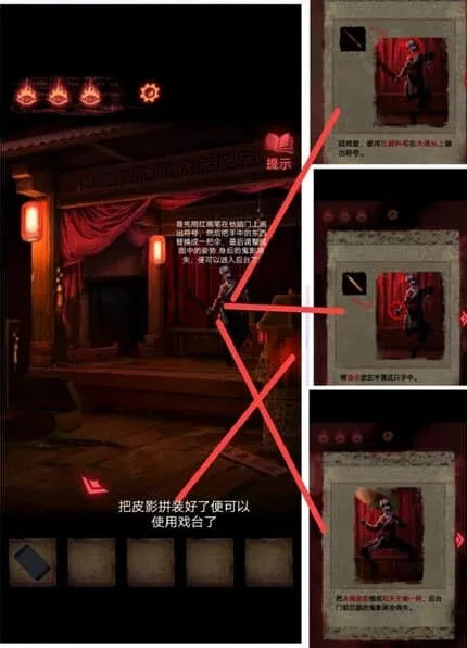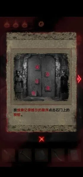 7、最后一步我们可以在墙上获得一把大刀,地方就会坍塌,使用大刀卡掉戏台上的木偶,能够后的一个奇怪的符号,回到门口,梁少平会提醒玩家机关在童子的眼睛上,关门后按照如图顺序点击按钮。
