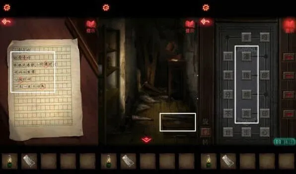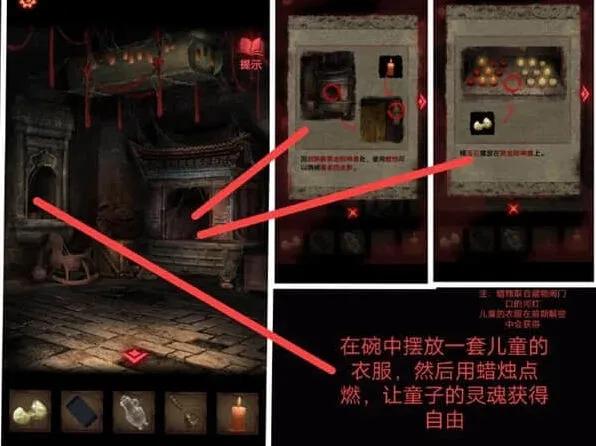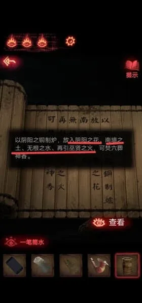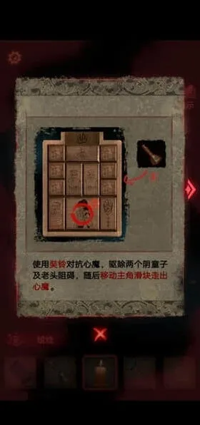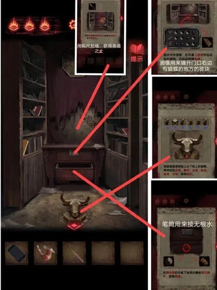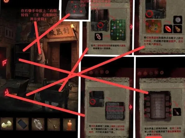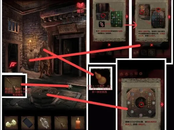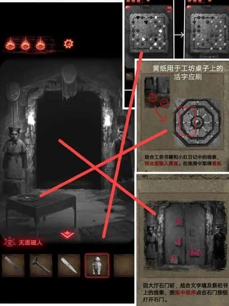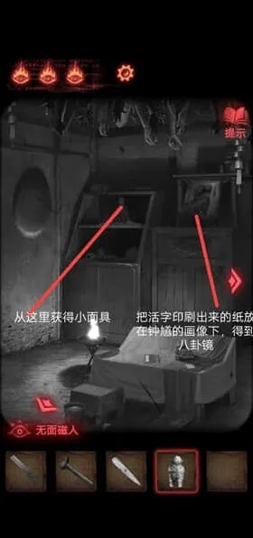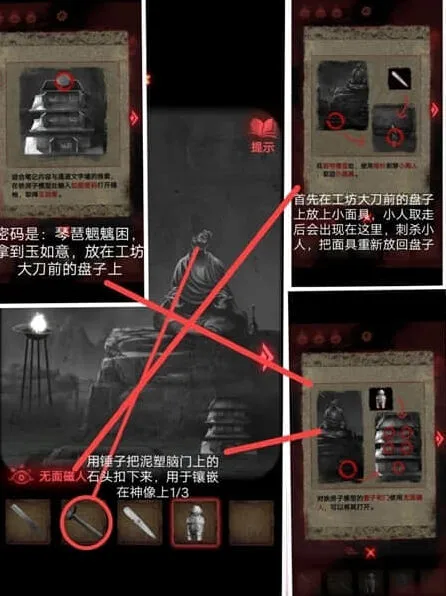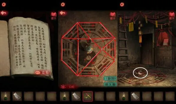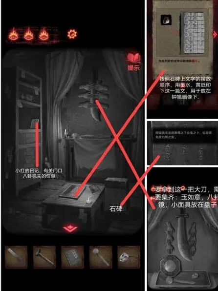 6、架子上的小红日记,可以获得八卦机关的信息,按照石碑上文字的拜访顺序,用墨水、黄纸印下着一篇文,用于放在钟馗画像,拿到一把大刀需要集齐玉如意、八卦镜,将小面具放在盘子上。