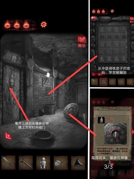 3、集齐三块石头后镶嵌在神像上方可打开暗门,从中获得铁房子的密码:琴琶魍魑困。
