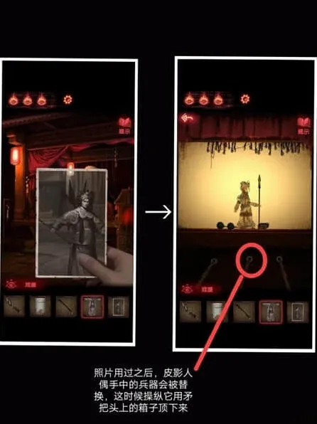 5、我们使用照片,可以把皮影人手中的兵器替换,操纵皮影人用矛把头顶的箱子给弄下来。