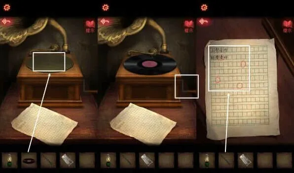 9、用煤油灯把桌子上的蜡烛点燃,依据之前日记本的提示,将架子上的物品摆放正确的顺序,获得唱片,从架子中获得铅笔,日记本后面还有半张照片。