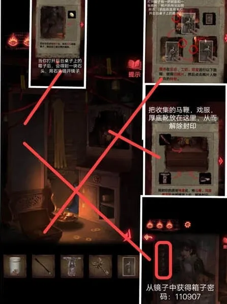 4、我们打开地图左下角的箱子,可以获得一把钥匙和一张照片和一块石头,用法如图所示,使用石头来砸开镜子,将收集的马鞭、戏服、厚底靴放在如图位置,就能够解出封印。