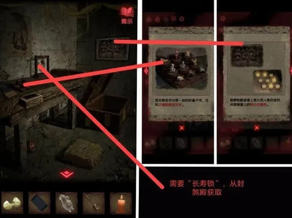 8、来到封煞殿按照正确的顺序来点燃蜡烛,在神龛上放置玉石可以获得锤子。