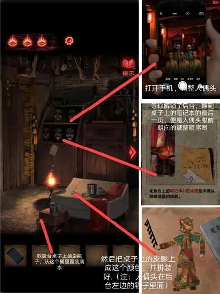 2、下一步我们打开手机,调整人偶的头,解锁后台之后,我们查看桌子上的笔记本,里面记载着人偶头的眼睛朝向和顺序,我们把桌子上的皮影按照如图的颜色,拼装好。