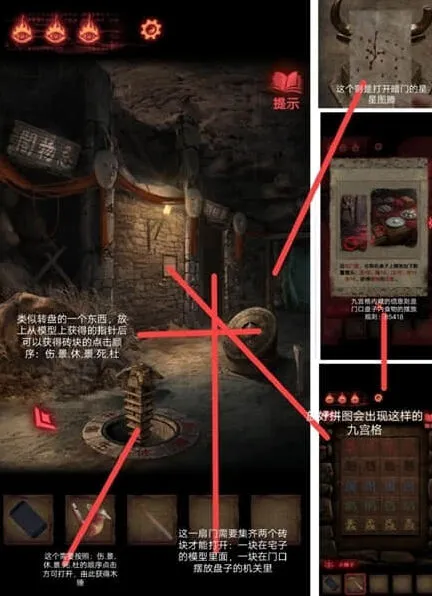 1、将黄纸用于在工坊的桌子上活字应刷,回到大厅的石门前,结合文字墙及祭祀书上的线索,按照图中顺序点击石门按钮,打开石门。