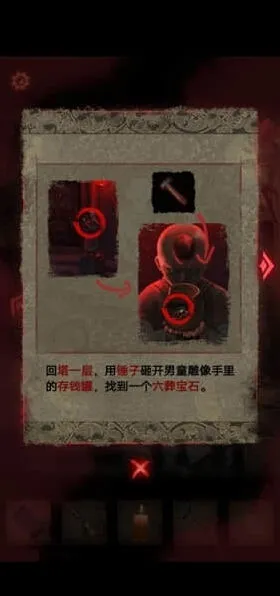 6、回到塔一层,用锤子打开男童雕像手中的存钱罐,找到一个六葬宝石。