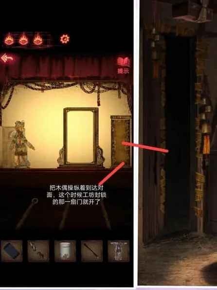 3、我们来到戏台前,操控木偶在布上来到另一边,现实中我们工坊门就打开了。