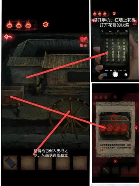 3、下一步我们打开收集,从墙上可以获得花轿线索,给下面的水轮倒入无根之水,获得胭脂盒。